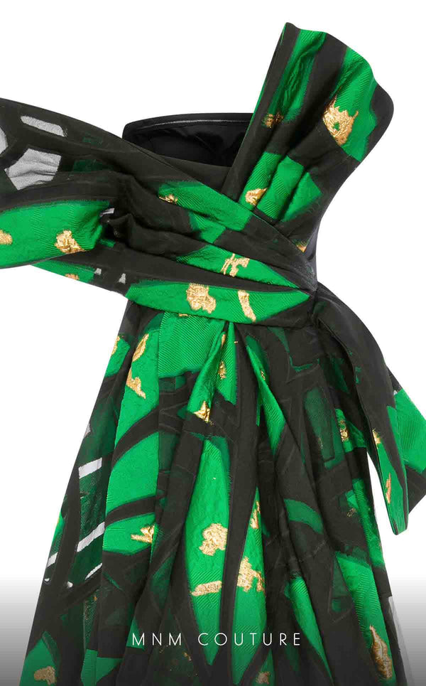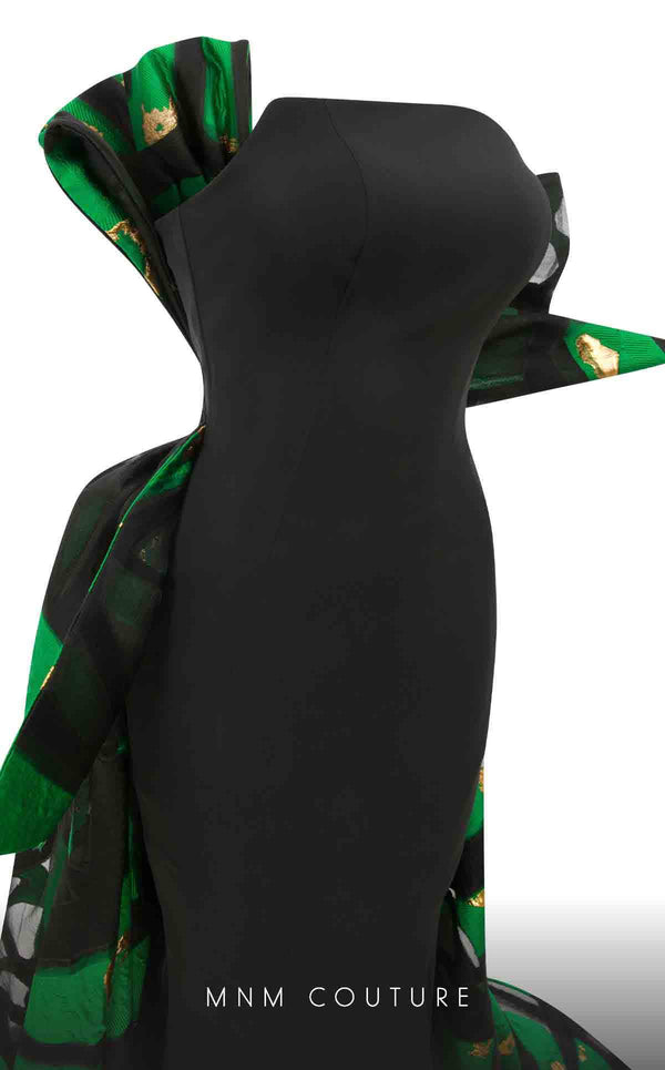 MNM Couture N0395 is a timeless choice with its strapless design and fitted bodice. The trumpet skirt flares gracefully, while the pleated back and elegant train exude a classic sophistication.