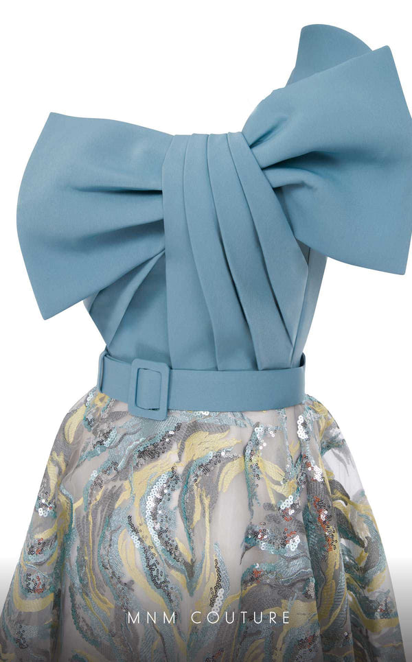 Capture elegance with the MNM Couture N0576 from Couture Shop LA. This Crepe with Fayet gown features a unique one-shoulder strap design and an asymmetric uppercut neckline and flared skirt. The bust is adorned with drapes and features an embroidered papillon on the shoulder, offering a whimsical yet sophisticated charm.