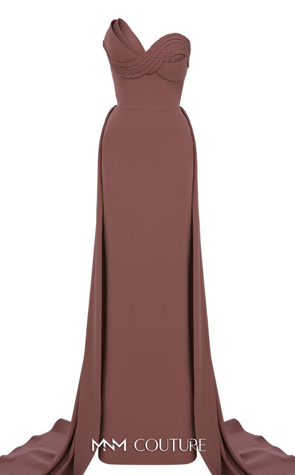 Experience modern sophistication with the MNM Couture N0687, a special occasion dress that redefines contemporary elegance. This luxurious haute couture evening gown is expertly crafted from high-quality rayon crepe, featuring a sleek, fitted column silhouette that exudes confidence. The design showcases an artistic asymmetric style, with a beautifully pleated section on one side and unique braided straps on the other, culminating in a sweetheart neckline. A thin fabric belt cinches the natural waistline, while a dramatic train-cut skirt, attached at the half-back, adds a final flourish of show-stopping glamour. This limited-quantity piece is a testament to innovative design, perfect for making an exclusive statement.